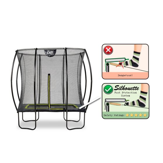 De vulling is bij de EXIT Silhouette trampoline extra dik en zorgt hierdoor voor nog meer bescherming. De PVC toplaag zorgt voor een verlenging van de levensduur. De beschermrand is stevig en voorzien van een speciaal, door EXIT Toys ontwikkeld, Foot Protection System (FPS) zodat je nooit met je voet tussen de veren kunt komen tijdens het trampolinespringen.